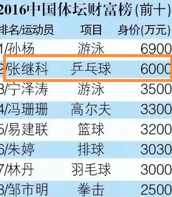 像2016年的中国体育融会员年收入名次榜上,张科继以6000万元排在第二名,仅有孙杨以6900万元超越了他。