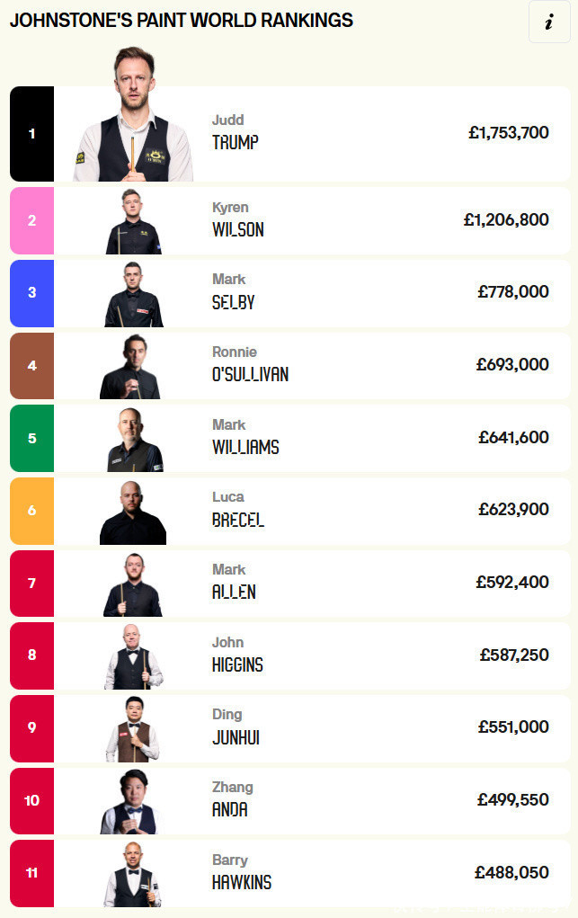 2025年斯诺克寰球公开赛领域后,惯例寰球名次TOP16,共有丁俊晖(9)、张安达(10)、斯佳辉(13)、肖国栋(16)等4名中国选手,前16名次具体如下特鲁姆普、K-威尔逊、塞尔比、奥沙利文、威廉姆斯、艾伦、希金斯、丁俊晖、张安达、霍金斯、墨菲、斯佳辉、卡特、J-威尔逊、肖国栋。