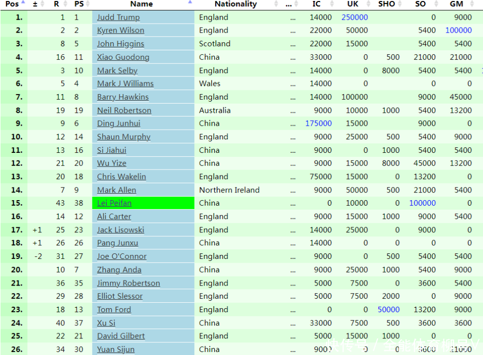 其中,肖国栋排在第4,他是中国斯诺克军团单赛季寰球名次最高的球员。另外,丁俊晖排在第9,斯佳辉排在第11,吴宜泽排在第12、雷佩凡排在第15、庞俊旭排在第18、张安达排在第20、徐念念排在第24、袁念念俊排在第26。