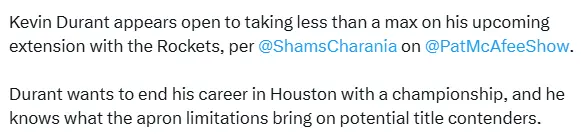 关于杜兰特加盟火箭,本日名记shams在节目中表示,杜兰特在与火箭队的续约琢磨中,似乎情愿罗致低于顶薪的协议。