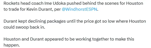 Windhorst还表示,杜兰特一直圮绝其他来往决策,直到价钱低到火箭齐无法圮绝的地步,骨子上他和火箭互助促成了他加盟休斯顿,并确保火箭险些以白菜价获得他。
